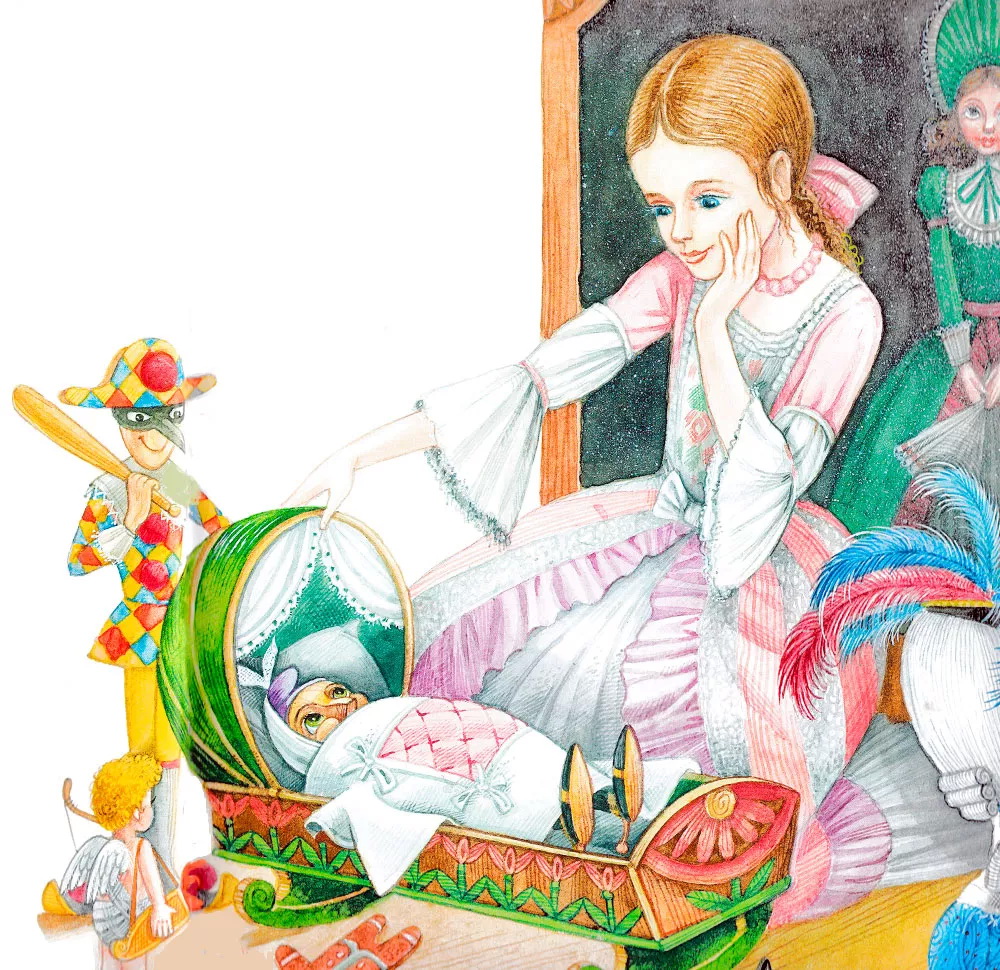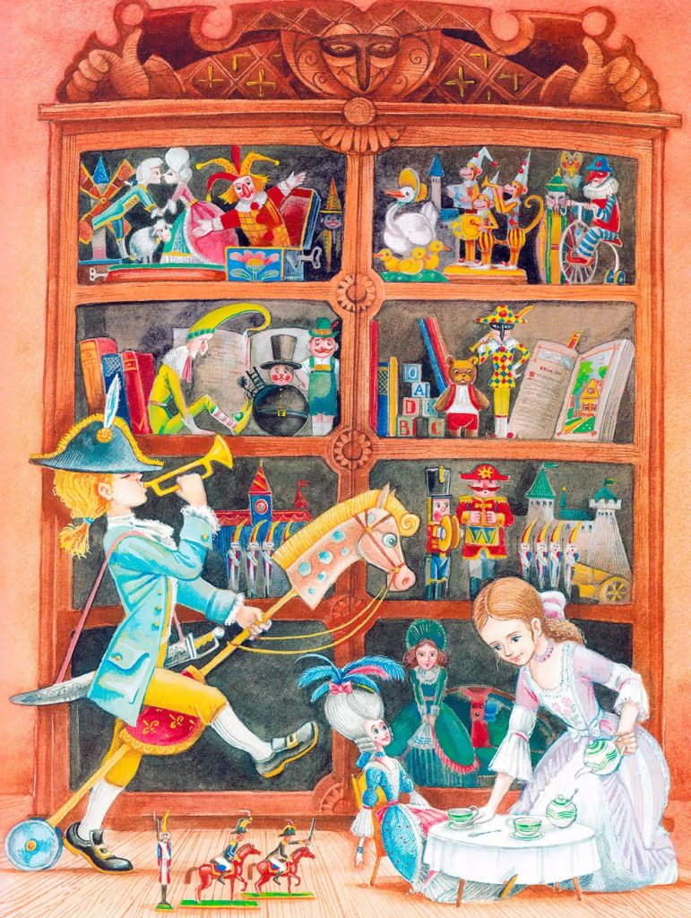 — Разве можно вам, государь, идти в бой, навстречу опасности, больным и с не зажившими ещё ранами! Взгляните, вот собираются ваши храбрые вассалы, они рвутся в бой и уверены в победе. Скарамуш, Панталоне, трубочисты, музыканты и барабанщик уже внизу, а среди куколок с сюрпризами у меня на полке заметно сильное оживление и движение. Соблаговолите, о государь, отдохнуть у меня на груди или же согласитесь созерцать вашу победу с высоты моей шляпы, украшенной перьями. — Так говорила Клерхен; но Щелкунчик вёл себя совсем неподобающим образом и так брыкался, что Клерхен пришлось поскорее поставить его на полку. В то же мгновение он весьма учтиво опустился на одно колено и пролепетал:
