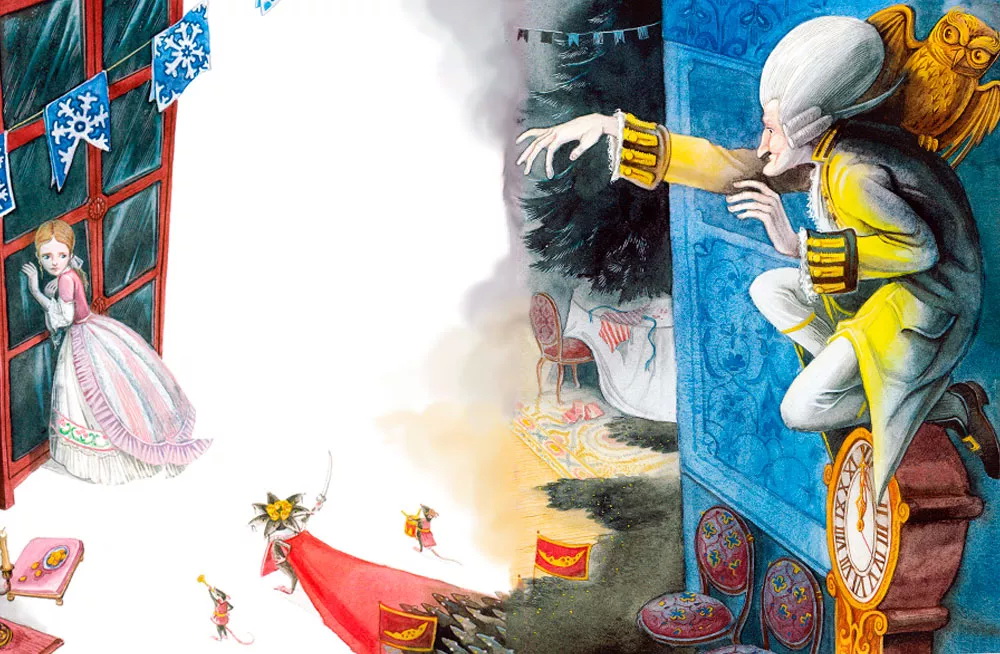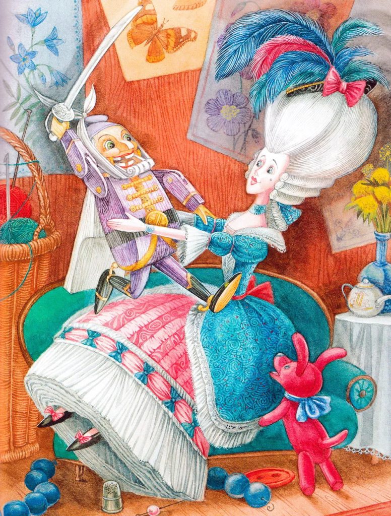 — Ах, Щелкунчик, миленький, — зашептала она, — пожалуйста, не сердись, что Фриц сделал тебе больно: он ведь не нарочно. Просто он огрубел от суровой солдатской жизни, а так он очень хороший мальчик, уж поверь мне! А я буду беречь тебя и заботливо выхаживать, пока ты совсем не поправишься и не повеселеешь. Вставить же тебе крепкие зубки, вправить плечи — это уж дело крёстного Дроссельмейера: он на такие штуки мастер…