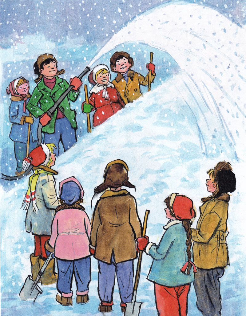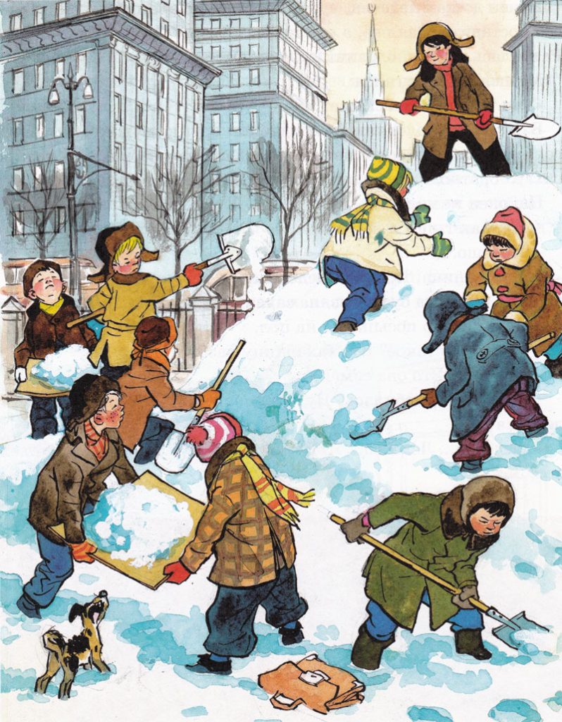 Целый день ребята трудились — строили снежную горку во дворе. Сгребали лопатами снег и сваливали его под стенку сарая в кучу.