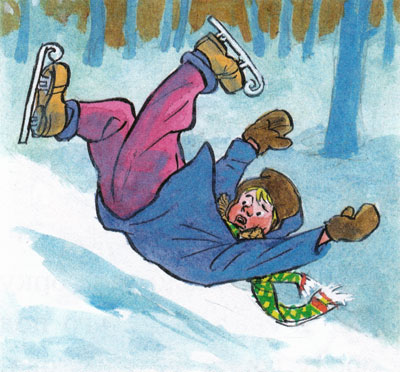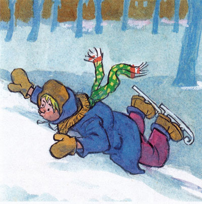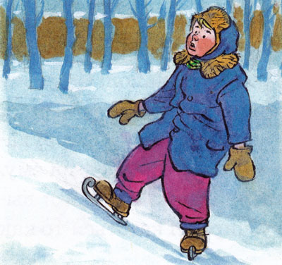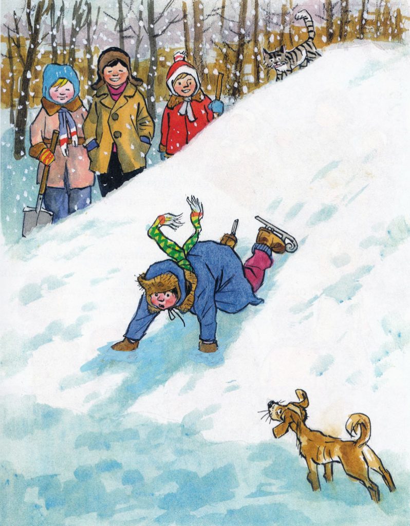 Ему ребята кричат, чтоб шел горку строить, а он только руками за окном разводит да головой мотает, — как будто нельзя ему. А когда ребята ушли, он быстро оделся, нацепил коньки и выскочил во двор. Чирк коньками по снегу, чирк! И кататься-то как следует не умеет! Подъехал к горке.