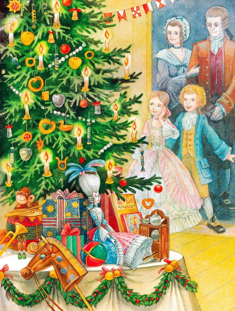 Большая ёлка посреди комнаты была увешана золотыми и серебряными яблоками, а на всех ветках, словно цветы или бутоны, росли обсахаренные орехи, пёстрые конфеты и вообще всякие сласти. Но больше всего украшали чудесное дерево сотни маленьких свечек, которые, как звёздочки, сверкали в густой зелени, и ёлка, залитая огнями и озарявшая всё вокруг, так и манила сорвать растущие на ней цветы и плоды. Вокруг дерева всё пестрело и сияло. И чего там только не было! Не знаю, кому под силу это описать!.. Мари увидела нарядных кукол, хорошенькую игрушечную посуду, но больше всего обрадовало её шёлковое платьице, искусно отделанное цветными лентами и висевшее так, что Мари могла любоваться им со всех сторон; она и любовалась им всласть, то и дело повторяя:
