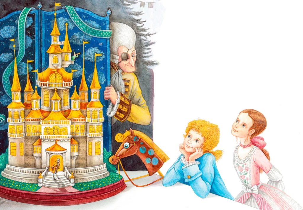 Только что дети, немного угомонившись, хотели взяться за книжки с картинками, лежавшие раскрытыми на столе, чтобы можно было любоваться разными замечательными цветами, пёстро раскрашенными людьми и хорошенькими играющими детками, так натурально изображенными, будто они и впрямь живые и вот-вот заговорят, — так вот, только что дети хотели взяться за чудесные книжки, как опять прозвенел колокольчик. Дети знали, что теперь черёд подаркам крёстного Дроссельмейера, и подбежали к столу, стоявшему у стены. Ширмы, за которыми до тех пор был скрыт стол, быстро убрали. Ах, что увидели дети! На зелёной, усеянной цветами лужайке стоял замечательный замок со множеством зеркальных окон и золотых башен. Заиграла музыка, двери и окна распахнулись, и все увидели, что в залах прохаживаются крошечные, но очень изящно сделанные кавалеры и дамы в шляпах с перьями и в платьях с длинными шлейфами. В центральном зале, который так весь и сиял (столько свечек горело в серебряных люстрах!), под музыку плясали дети в коротких камзольчиках и юбочках. Господин в изумрудно-зелёном плаще выглядывал из окна, раскланивался и снова прятался, а внизу, в дверях замка, появлялся и снова уходил крёстный Дроссельмейер, только ростом он был с папин мизинец, не больше.