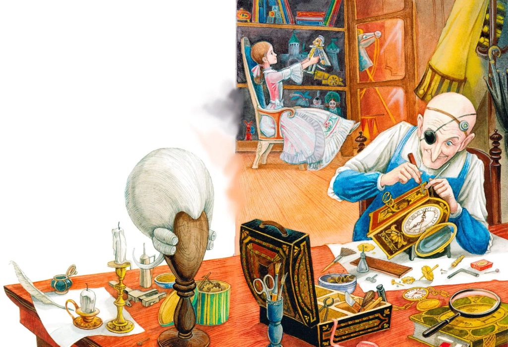 Раз как-то случилось, что крёстный чинил часы у Штальбаумов. Мари сидела около стеклянного шкафа и, грезя наяву, глядела на Щелкунчика. И вдруг у неё вырвалось: