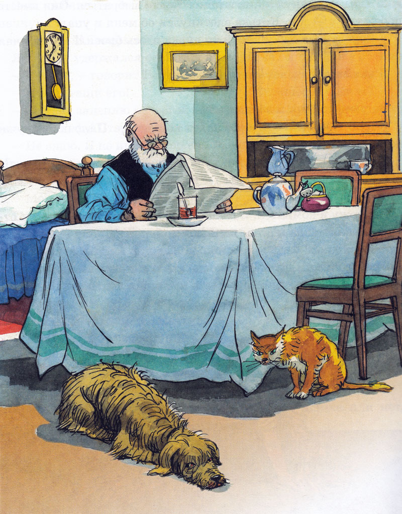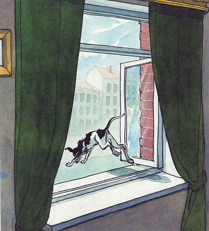 “Дедушке нашему хорошо! — подумал Барбоска. — Ушёл на работу и работает. Ваське тоже неплохо — убежал из дому и гуляет по крышам. А мне вот приходится сидеть, сторожить квартиру”.