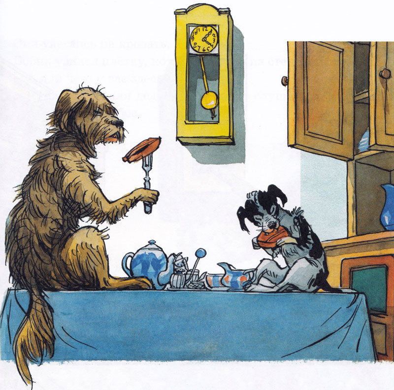 — Садись за стол, сейчас я тебя угощать буду — предложил Барбос.