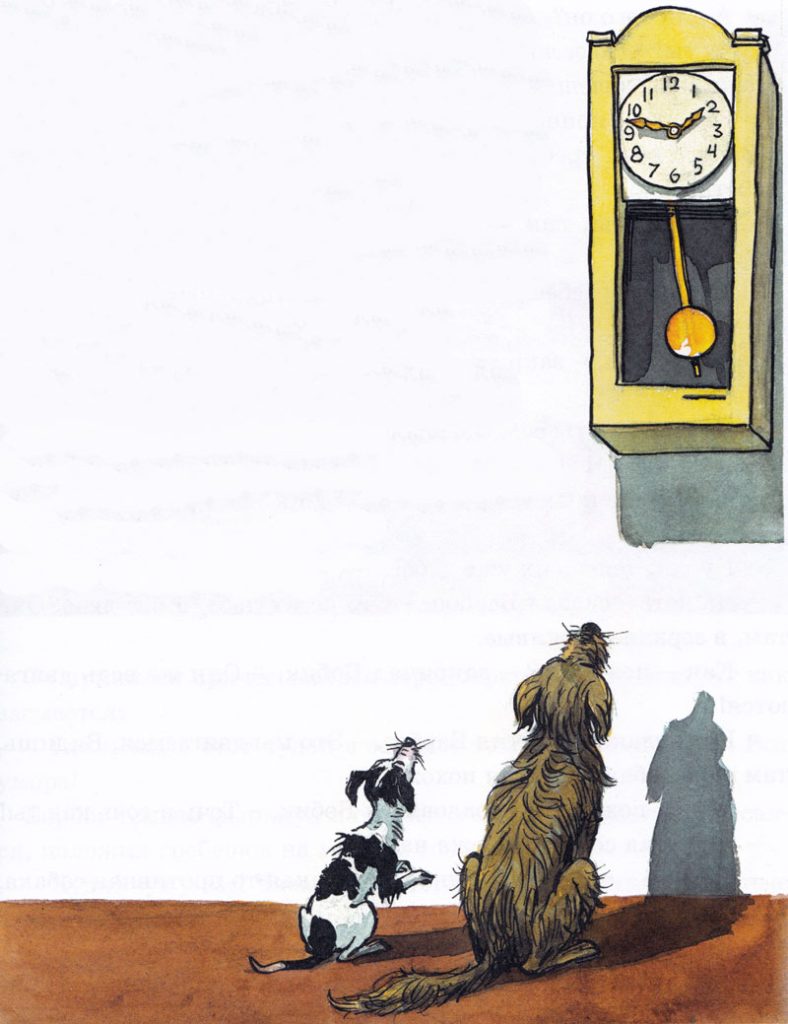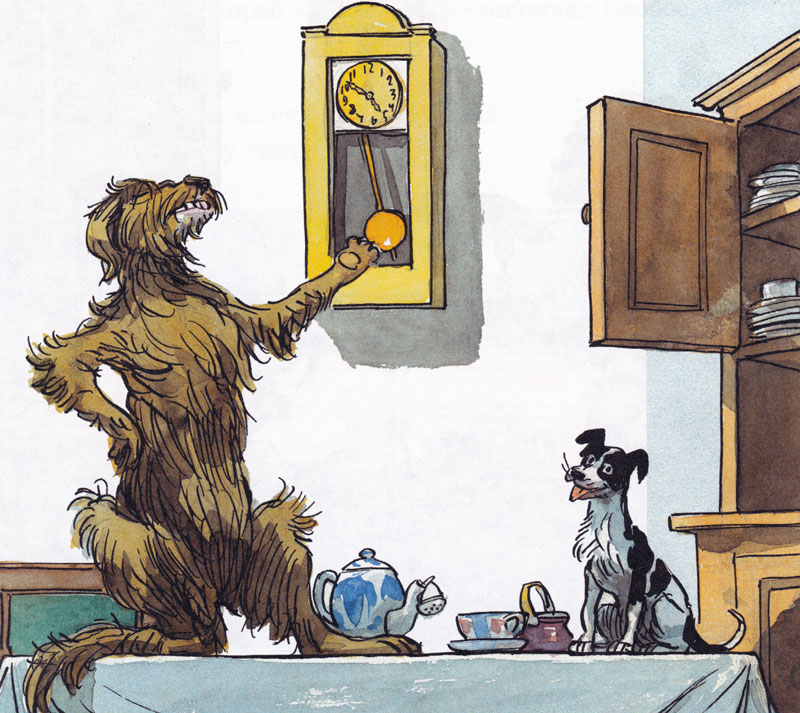 Он почесал лапой за ухом, потом увидел на стене часы с маятником и спрашивает: