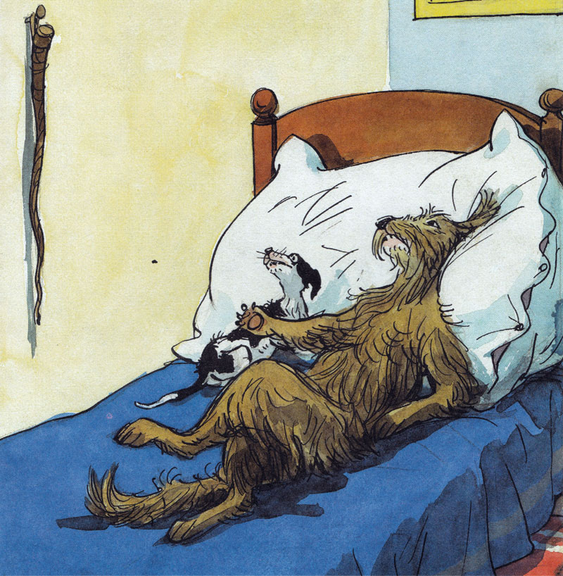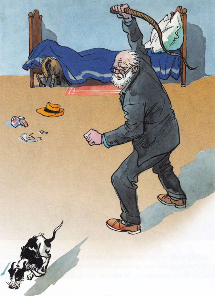 Он увидел на своей кровати двух псов, взял со стены плётку и замахнулся на них.