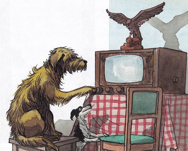 Барбос включил телевизор. Послышалась музыка. Собаки обрадовались, и давай прыгать по комнате. Плясали, плясали, из сил выбились.