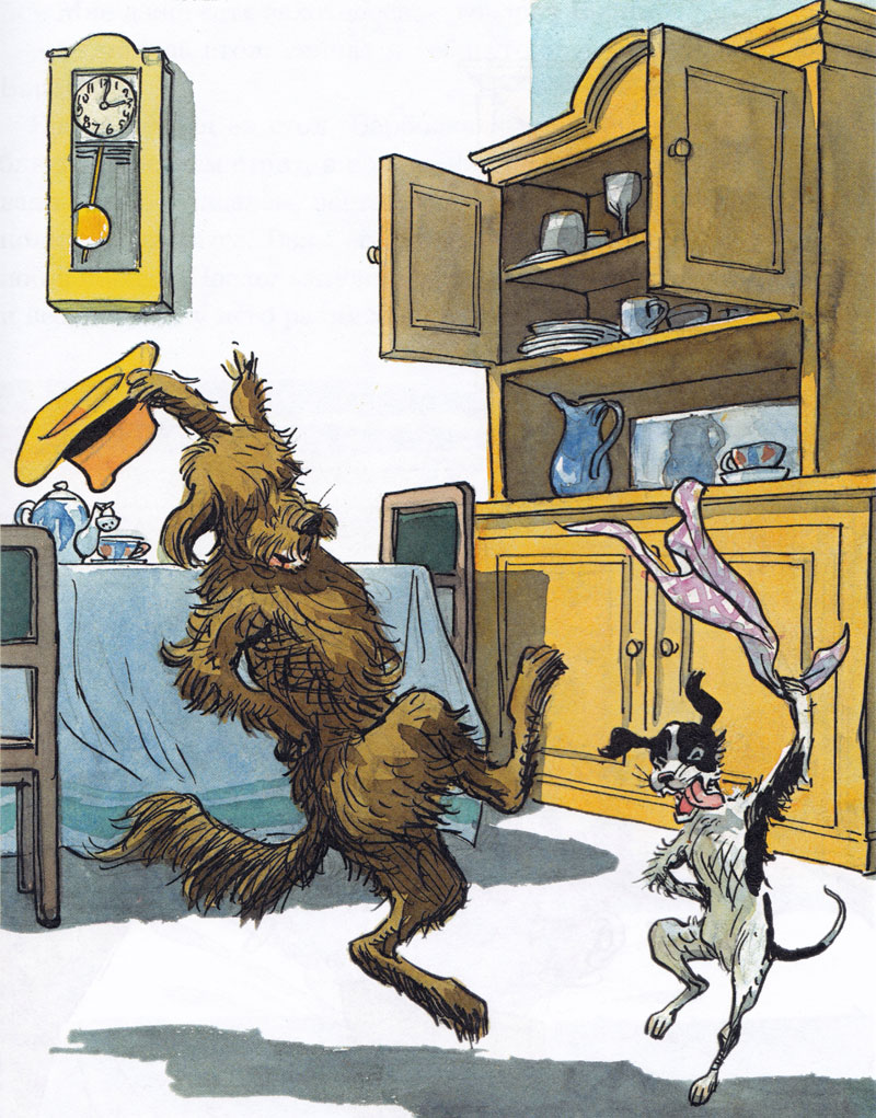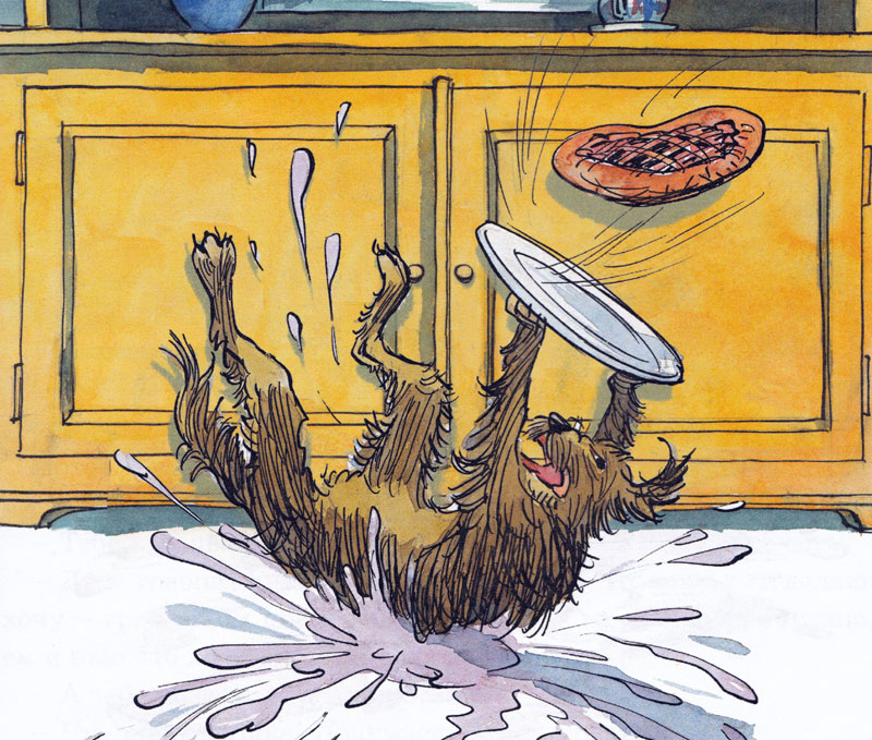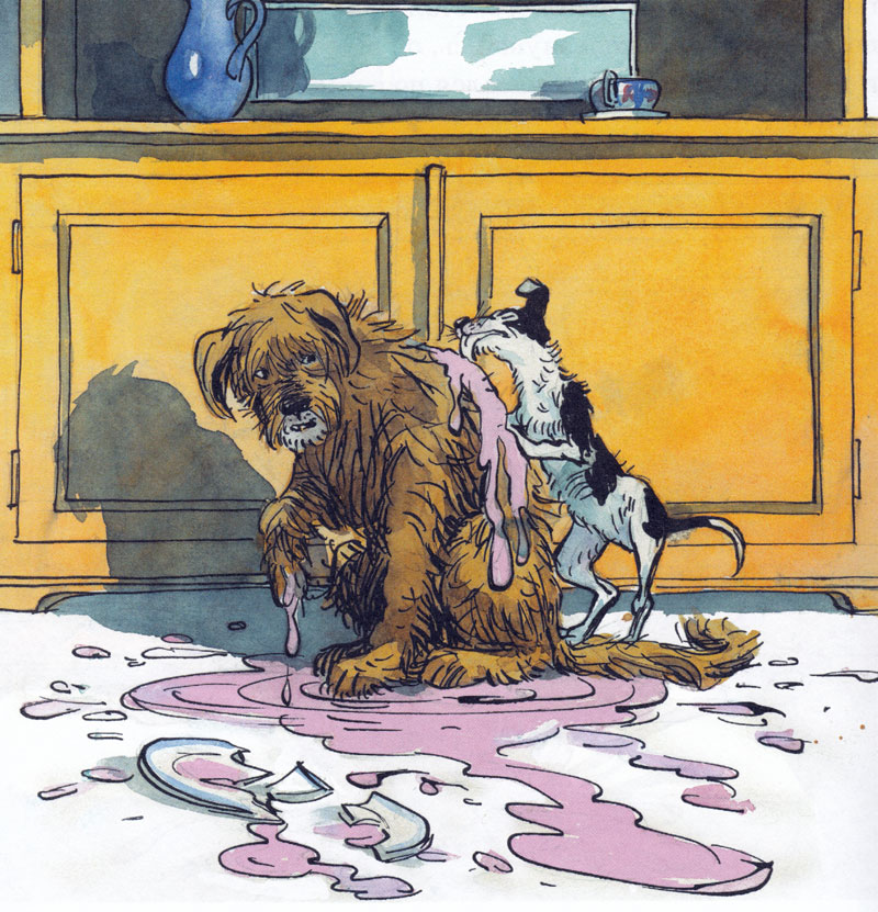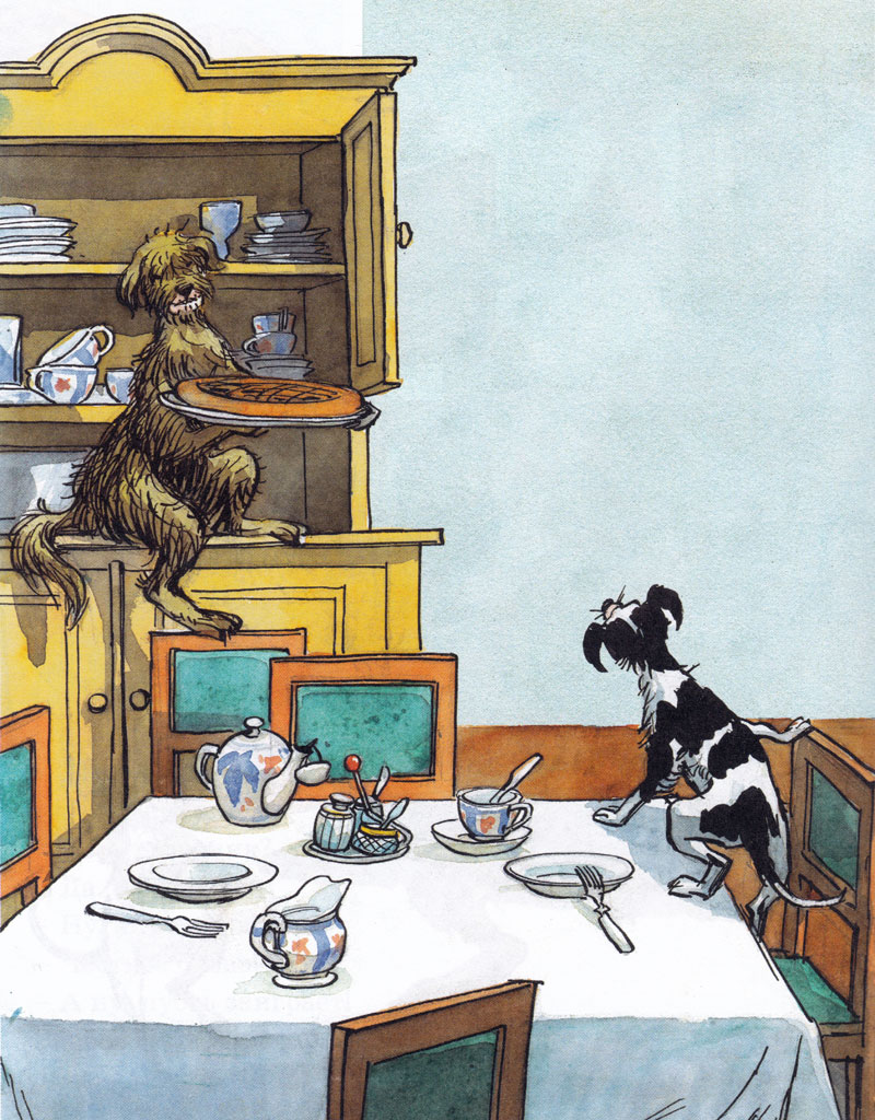 Бобик уселся за стол. Барбоска открыл буфет, видит — там блюдо с киселём стоит, а на верхней полке — большой пирог. Он взял блюдо с киселём, поставил на пол, а сам полез на верхнюю полку за пирогом. Взял его, стал вниз спускаться и попал лапой в кисель. Поскользнувшись, он шлёпнулся прямо на блюдо, и весь кисель у него размазался по спине.