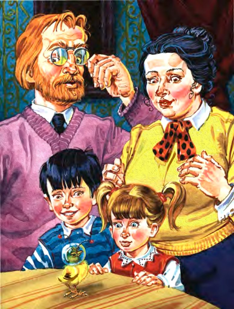 Знаете, кто выскочил из шоколадного яйца в прошлом году под Новый год в доме профессора Тиболла? Всем на удивление – космический цыпленок! Во всем он был похож как две капли воды на земного цыпленка. Только на голове у него была капитанская фуражка с телевизионной антенной на боку.