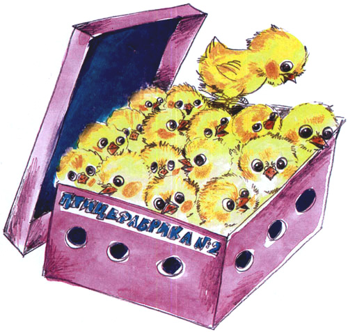 А был он инкубаторным цыпленком трех дней от роду — маленьким, желтым, пушистым комочком на тоненьких ножках и с тоненьким голоском: «Фип! Фип!» Вместе с тысячами — если тебя интересуют цифры, могу сказать точно: вместе с 39312 (знаешь, как это произносится? С тридцатью девятью тысячами тремястами двенадцатью) — братьями и сестрами он появился на свет в огромном здании, на котором красовалась вывеска: «Птицефабрика Э 2».