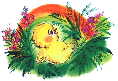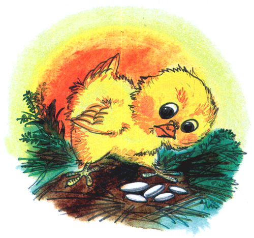 — Ты ищешь птичек? — спросила она. — Так вот: птички правда живут в гнездышке и правда несут яички, такие белые, кругловатые, а бывают и раскрашенные!
