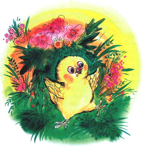Зеленый-зеленый луг, синее-синее небо, а там, в небе, что-то ослепительно золотое — Фип было глянул и поскорей снова зажмурился… А как тепло, какие чудесные запахи, какой ласковый ветерок! От ветерка чуть колышется зеленая трава — такая высокая, что не только Фипу можно спрятаться в ней с головой, — и важно покачивают хорошенькими головками цветы. Их так много, они такие разные! Желтые, красные, белые, лиловые… И повсюду, куда ни глянь, — птицы. Они то перелетают с цветка на цветок, с травинки на травинку, то подолгу вьются в воздухе на одном месте, то стремительно, с жужжанием проносятся у Фипа над самой головой.