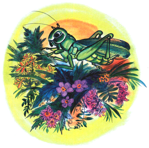 Фип посмотрел туда, куда показывала Лягушка, и увидел большого зеленого Кузнечика. Кузнечик сильно чиркнул ножкой по крылу, еще, еще — и полилась всем знакомая песенка.