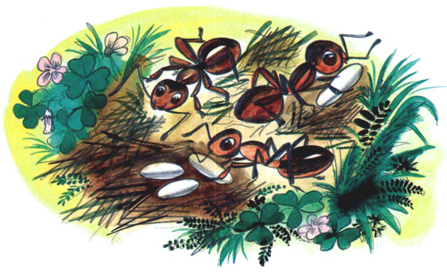 А у нас, у муравьев, — ого-го! У нас, брат, царица за день столько яичек отложит — и счету нет! Мильон! А то даже тыщу!